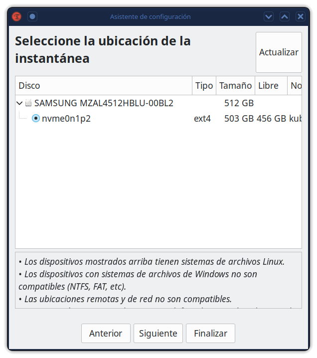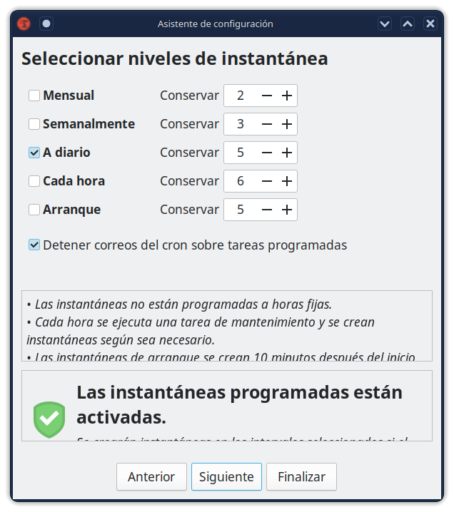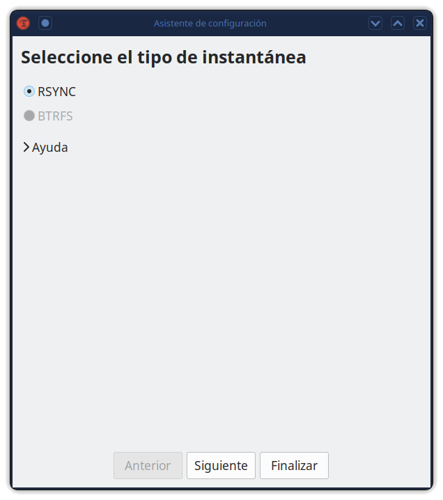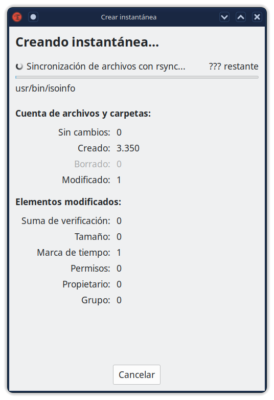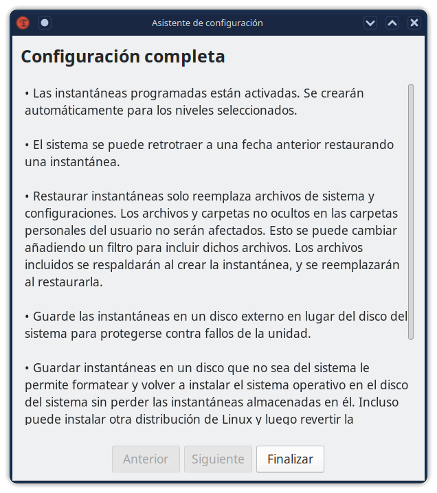 Las instantáneas se toman usando rsync y enlaces duros. Los archivos comunes se comparten entre instantáneas que ahorran espacio en disco. Cada instantánea es una copia de seguridad completa del sistema que se puede navegar con un administrador de archivos.