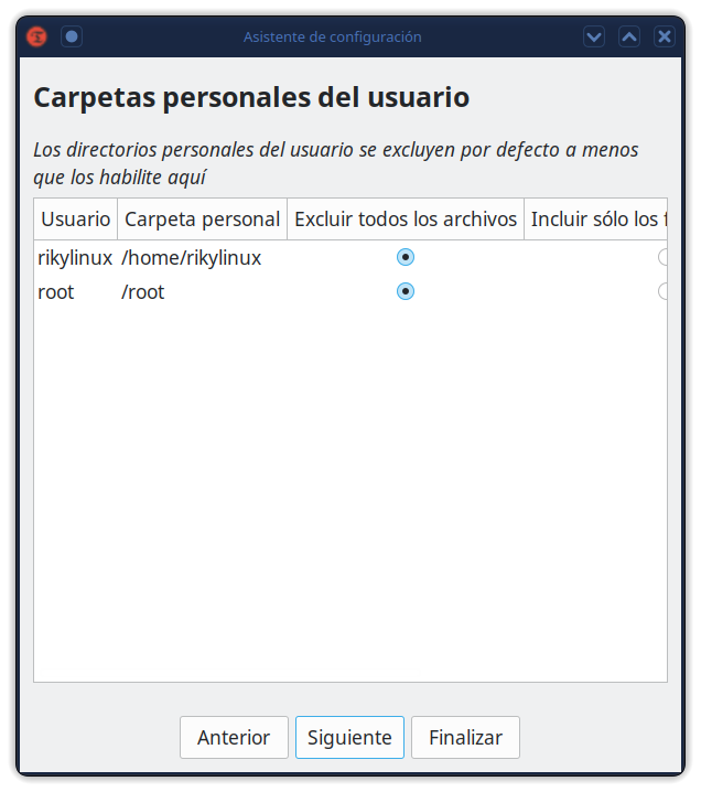 Está diseñado para proteger solo los archivos y configuraciones del sistema. Se excluyen los archivos de usuario, como documentos, imágenes y música. Esto asegura que sus archivos permanezcan sin cambios cuando restaure su sistema a una fecha anterior. Si necesita una herramienta para hacer una copia de seguridad de sus documentos y archivos, eche un vistazo a la excelente aplicación BackInTime, que es más configurable y proporciona opciones para guardar archivos de usuario.